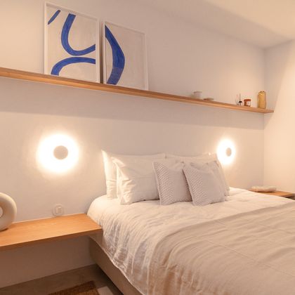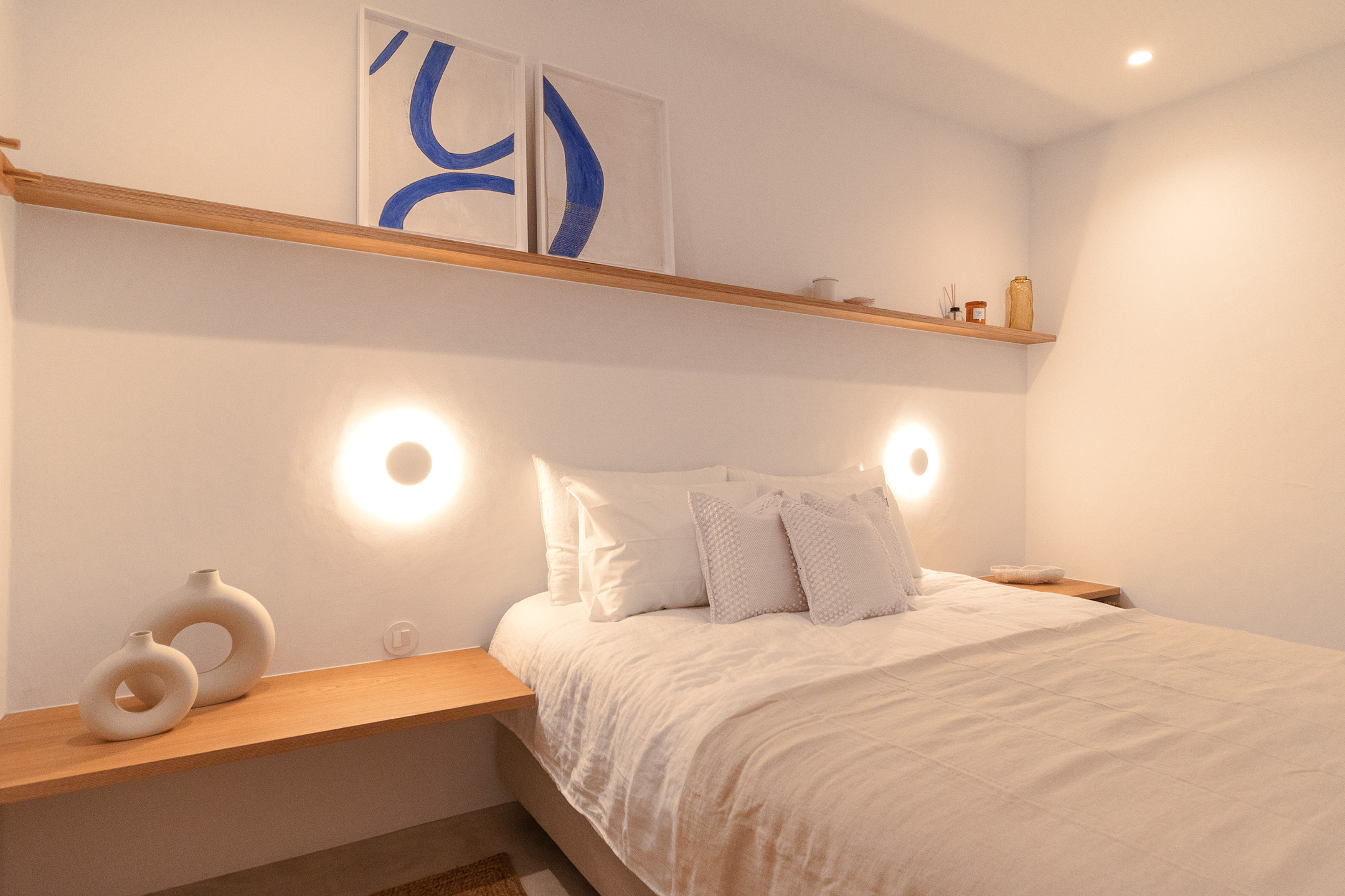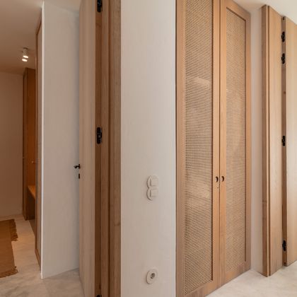 Apartments with full-height doors without lintel, rattan details, and furniture in oak plywood