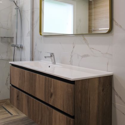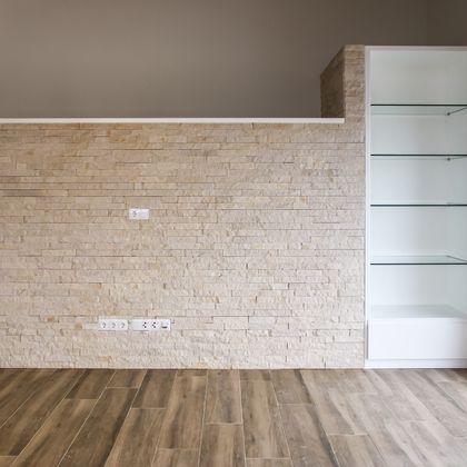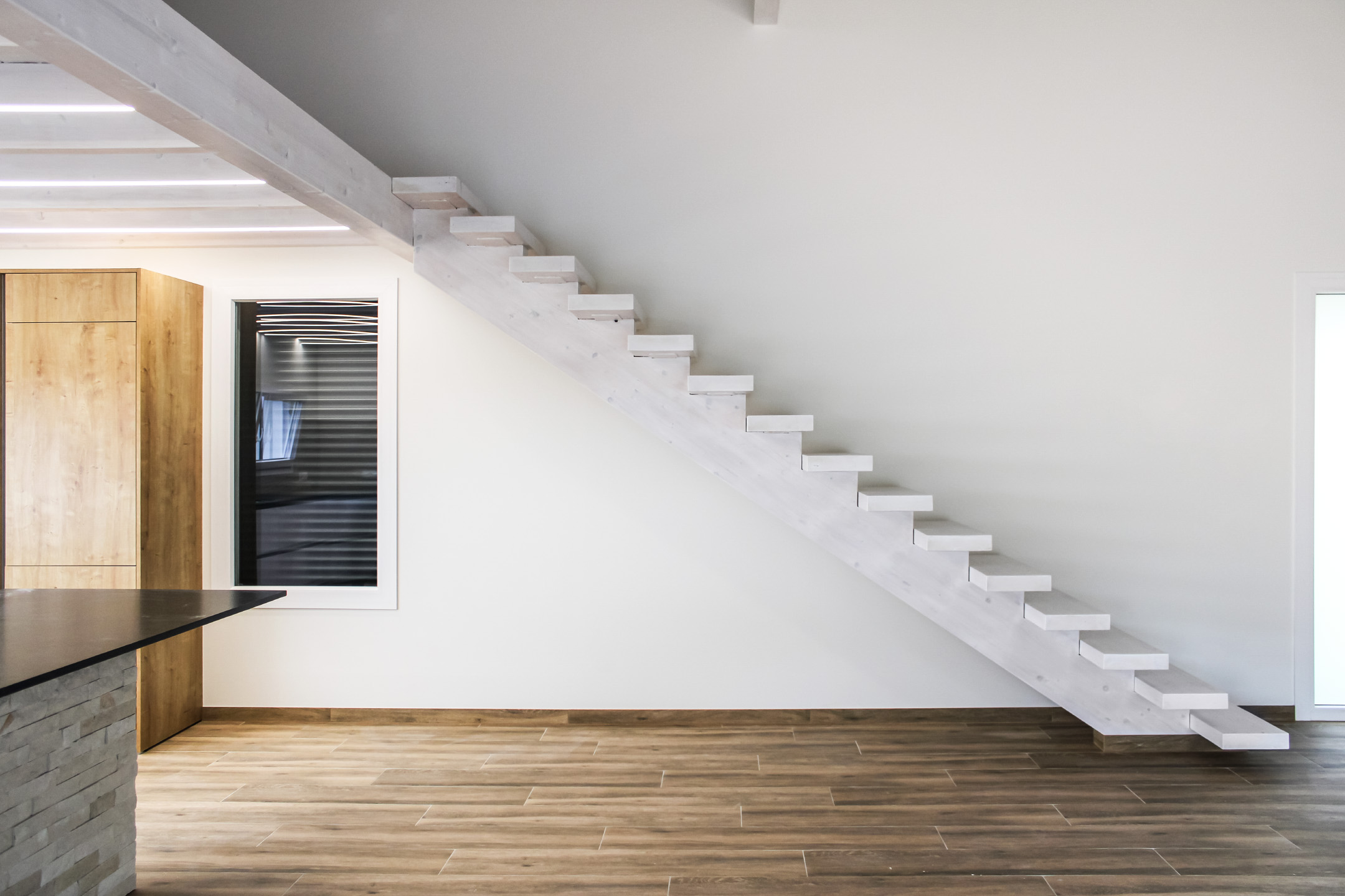 House with lacquered carpentry, built-in shelving unit on stone wall, kitchen in thermolaminate, and staircase in white-painted pine wood