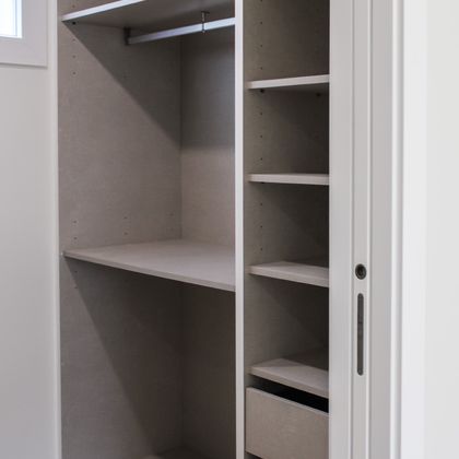 Logement avec menuiserie laquée, meuble étagère encastré dans un mur en pierre, cuisine en thermolaminé et escalier en pin peint en blanc