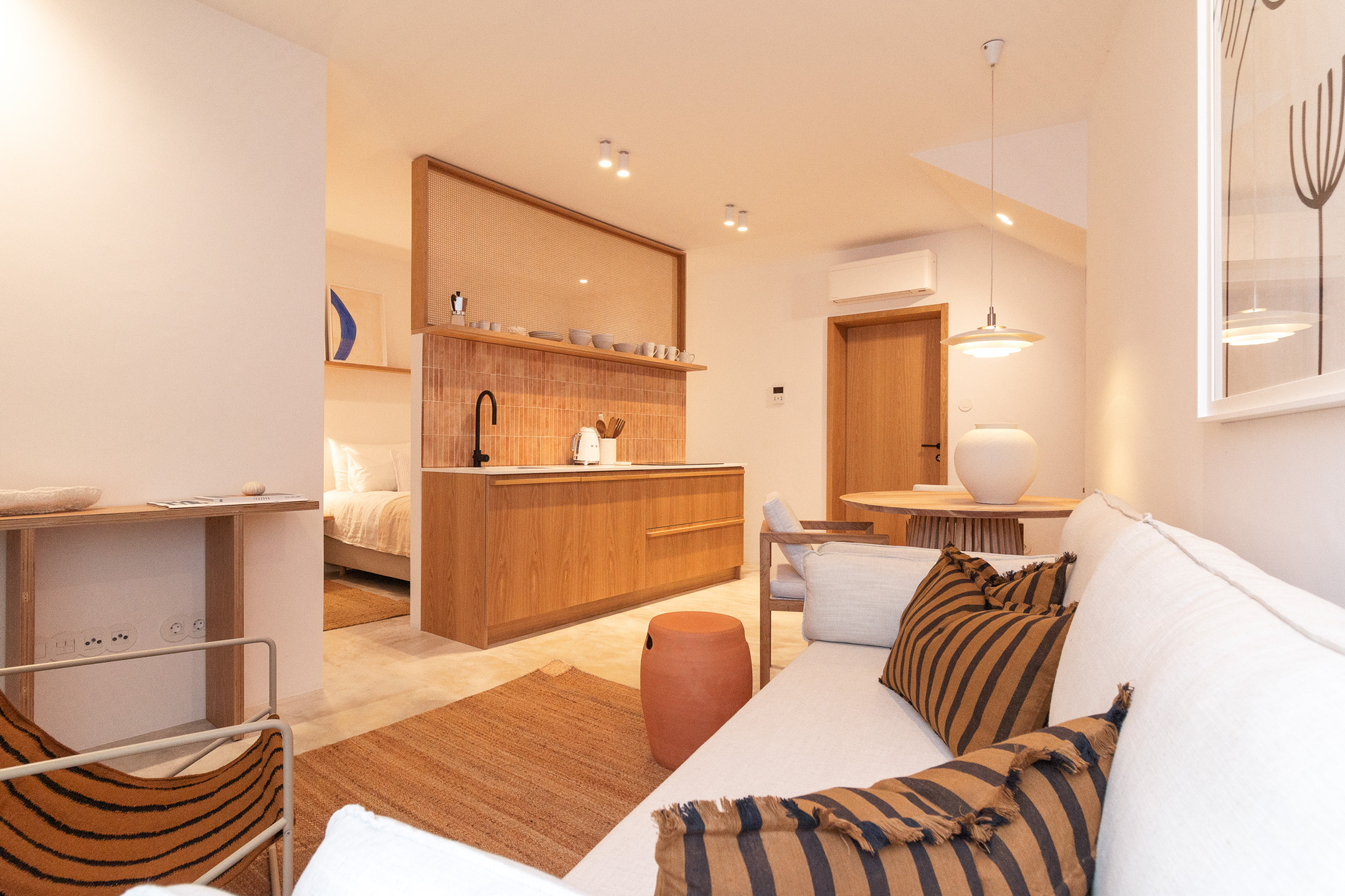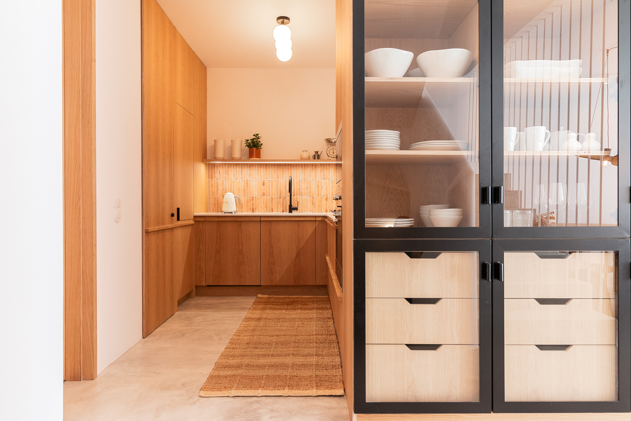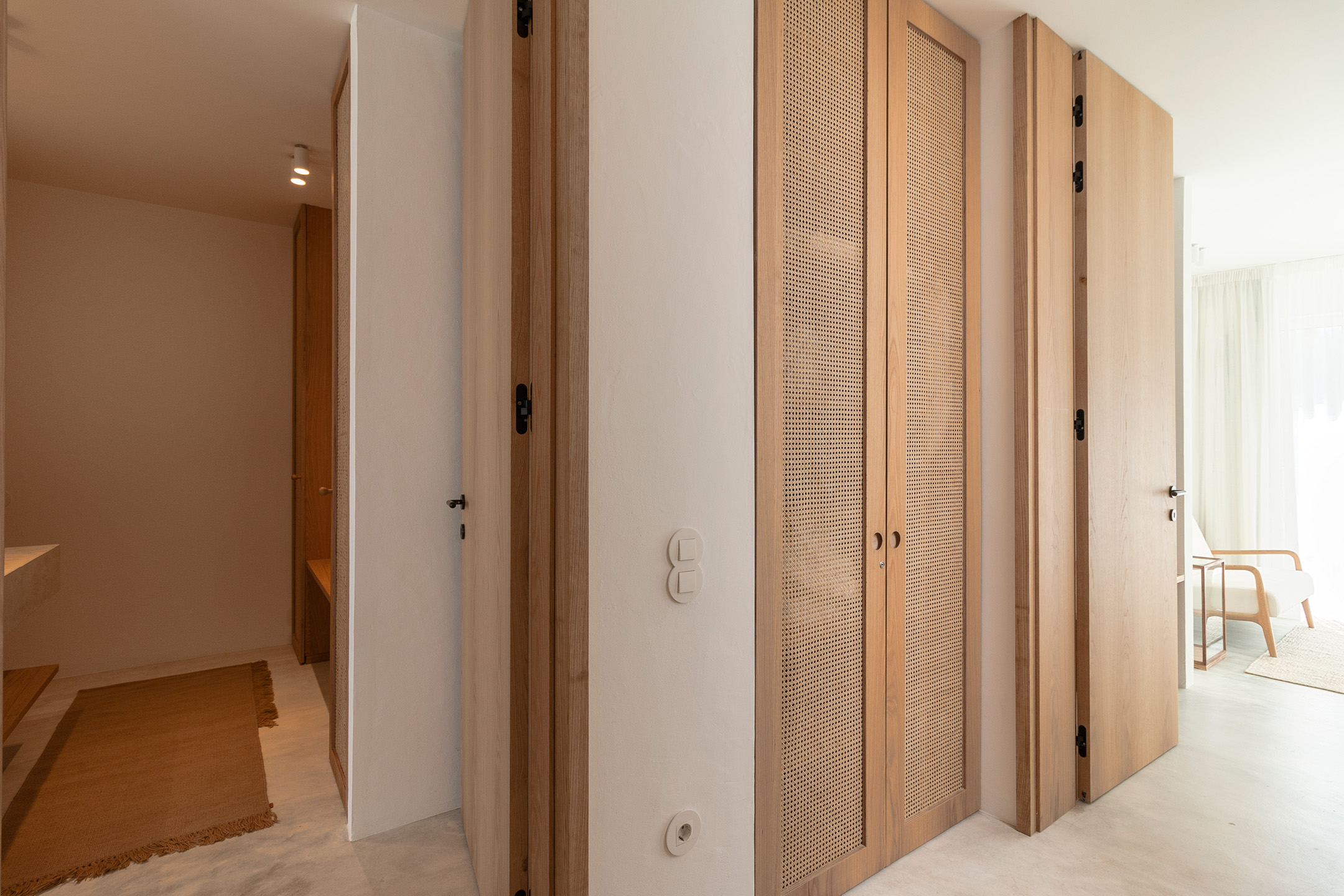 Apartamentos com portaros de altura total sem verga, detalhes em rattain e móveis em contraplacado de carvalho