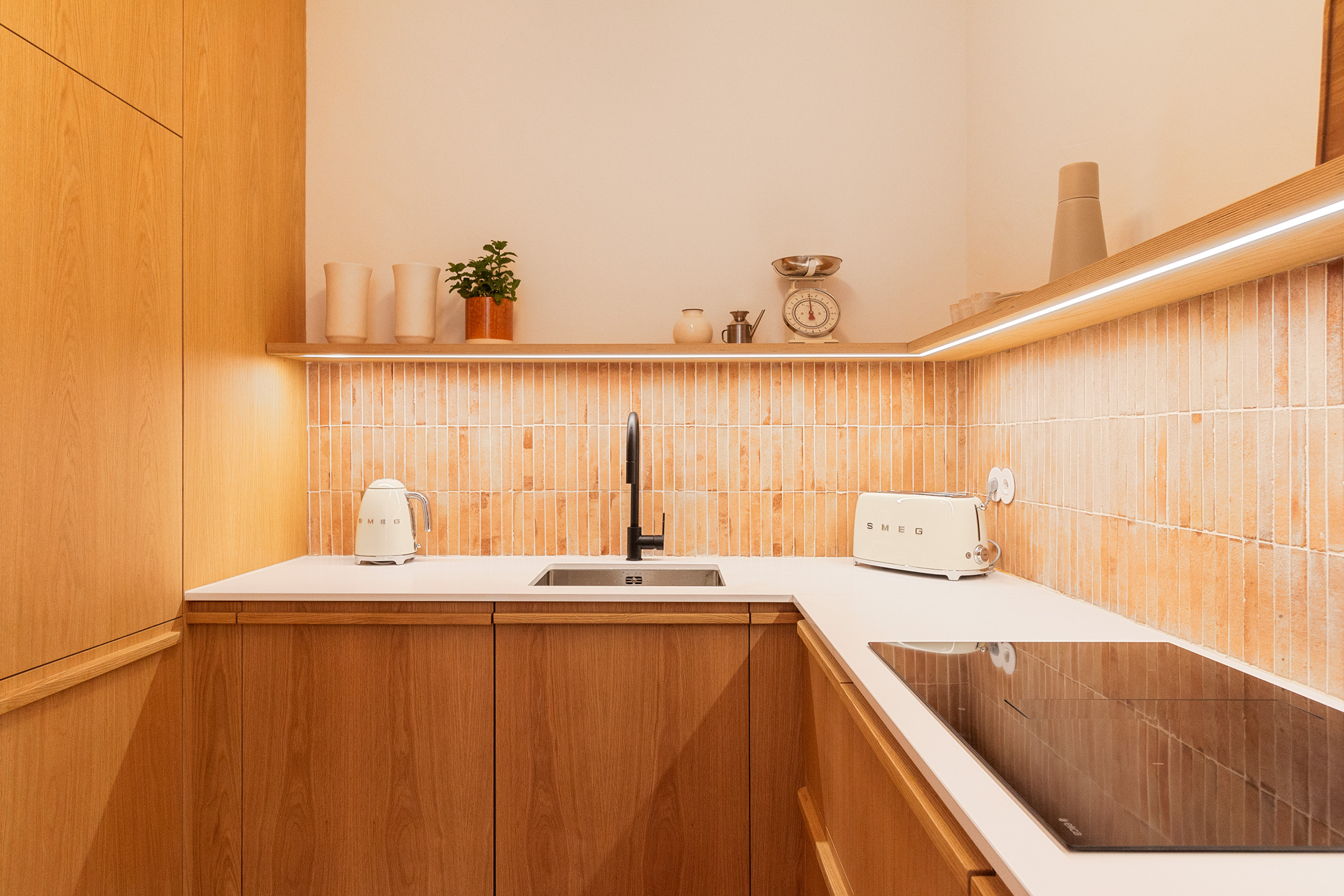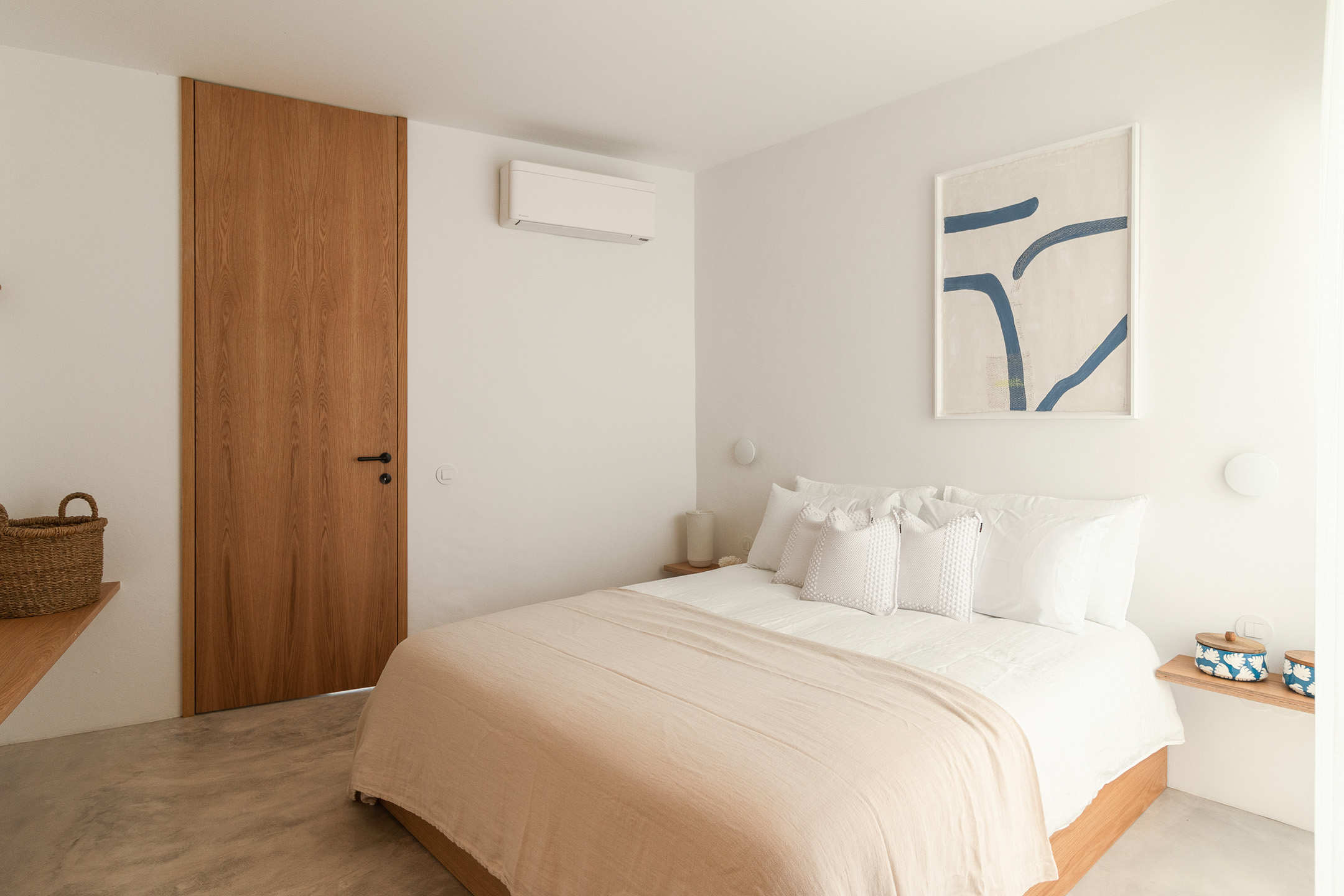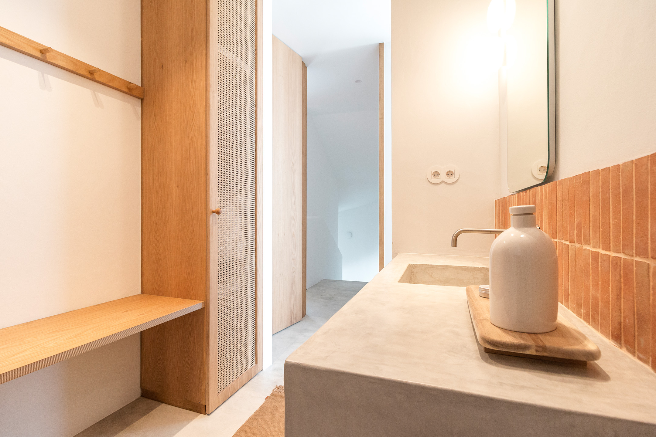 Apartamentos com portaros de altura total sem verga, detalhes em rattain e móveis em contraplacado de carvalho