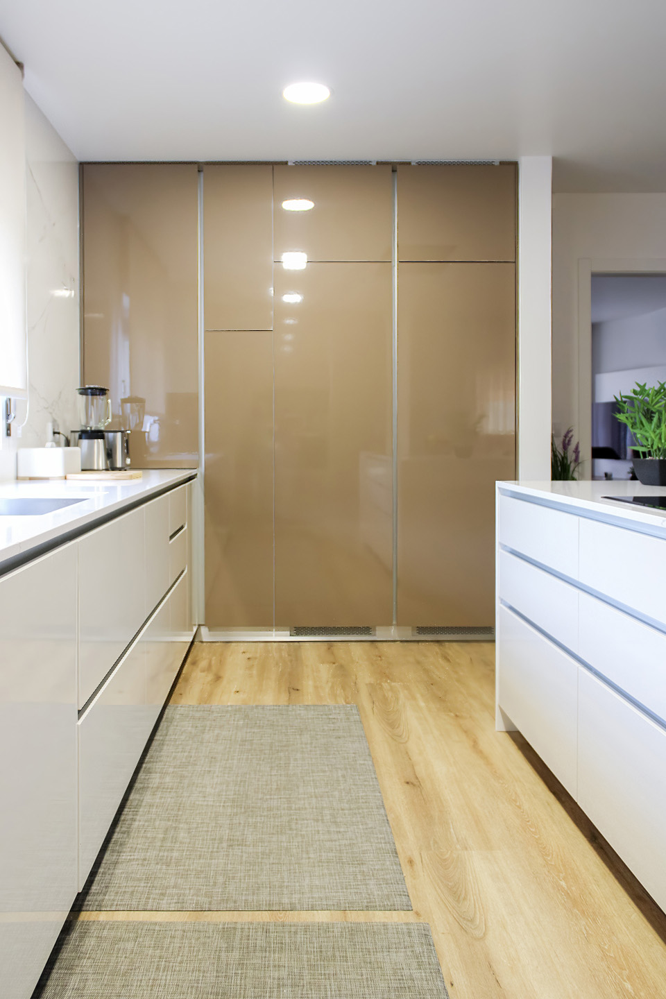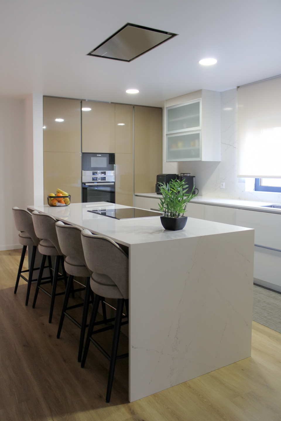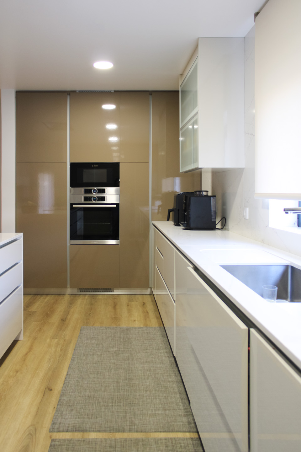 Moradia com cozinha em termolaminado brilhante e silestone calacata nas bancadas e parede