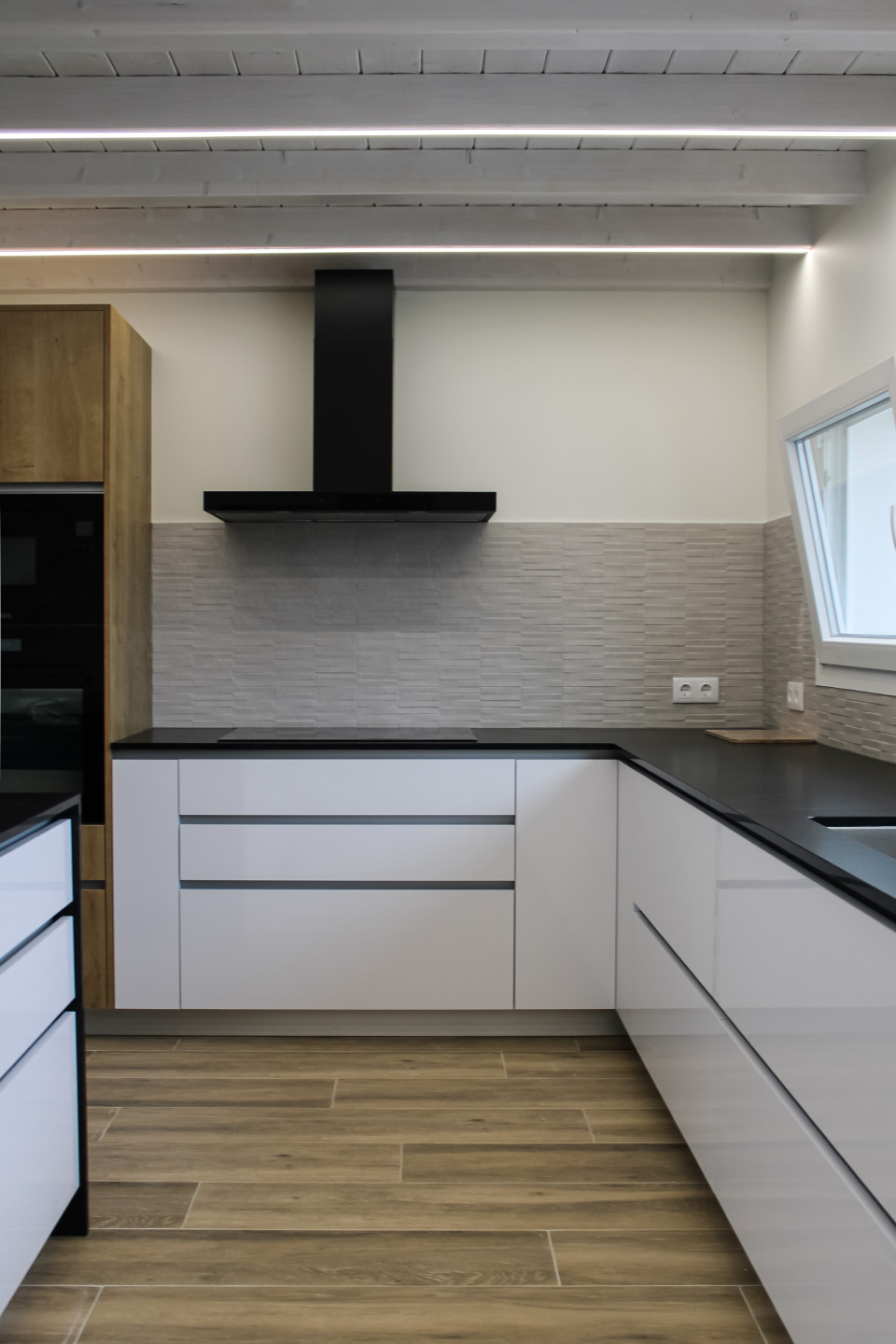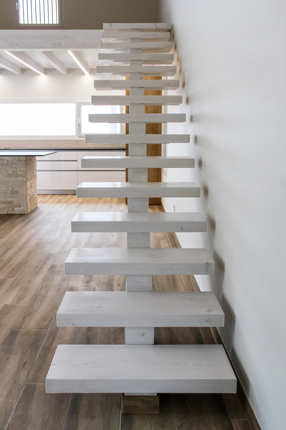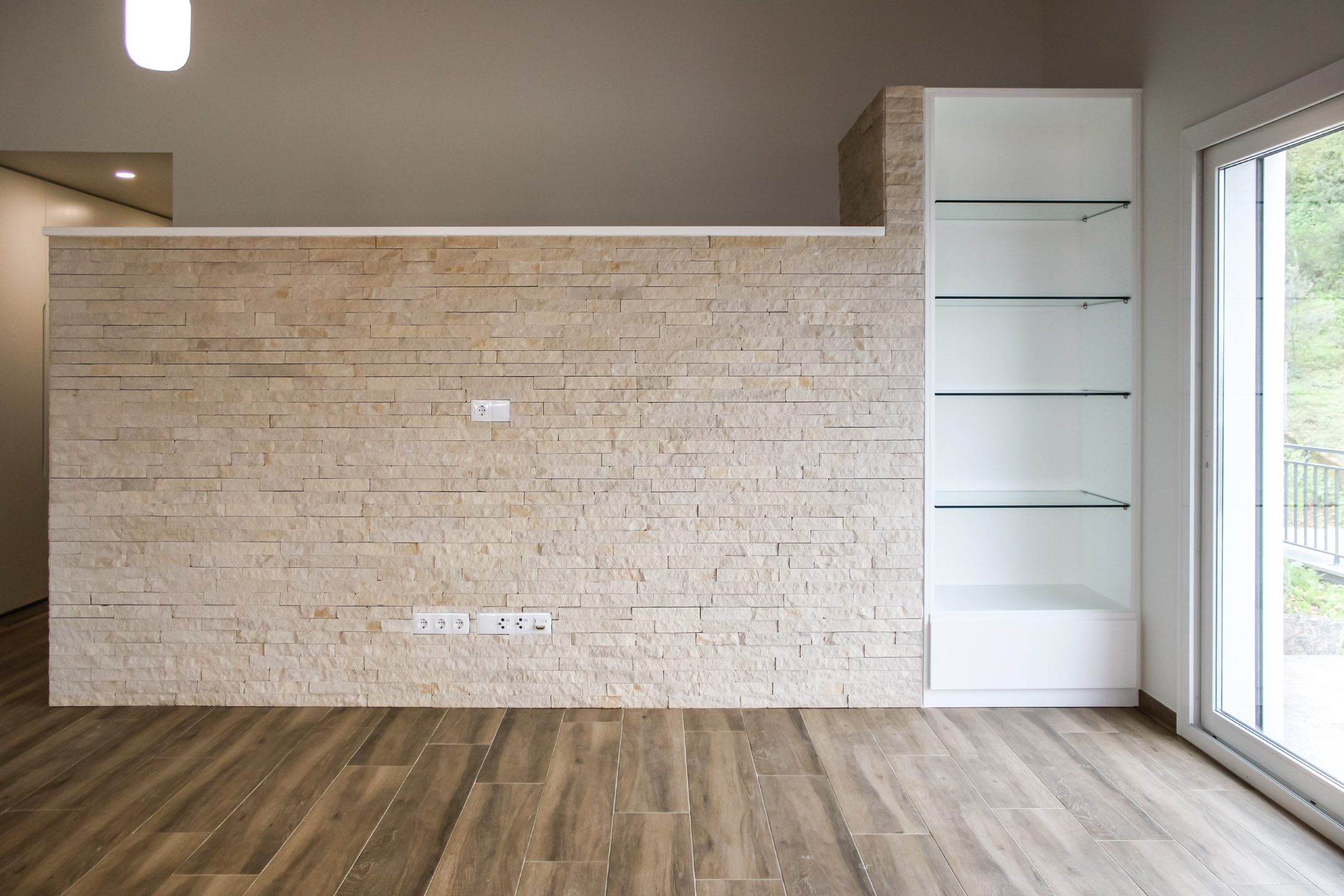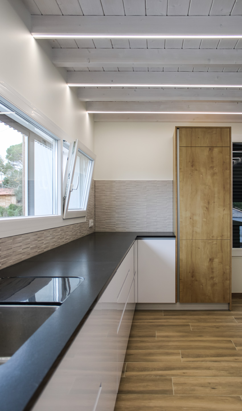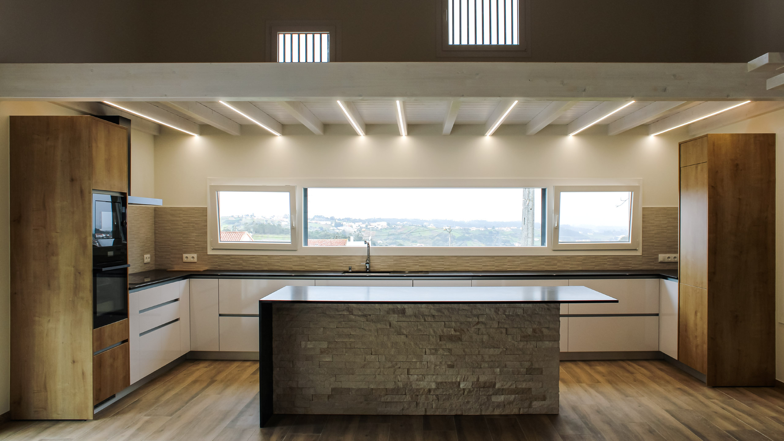 Moradia com carpintaria em lacado, móvel de estante embutido em parede de pedra, cozinha em termolaminado e escada em madeira de pinho pintado a branco