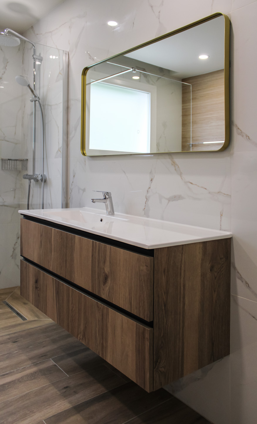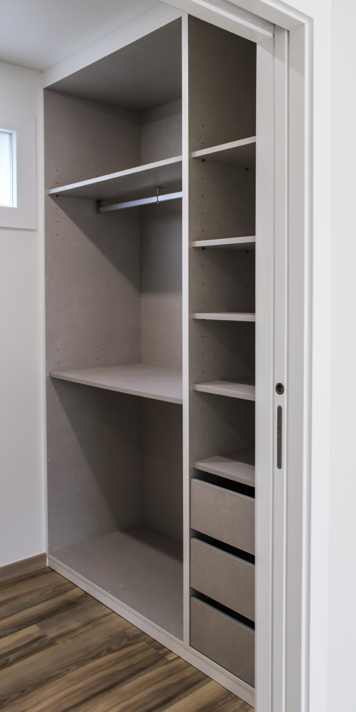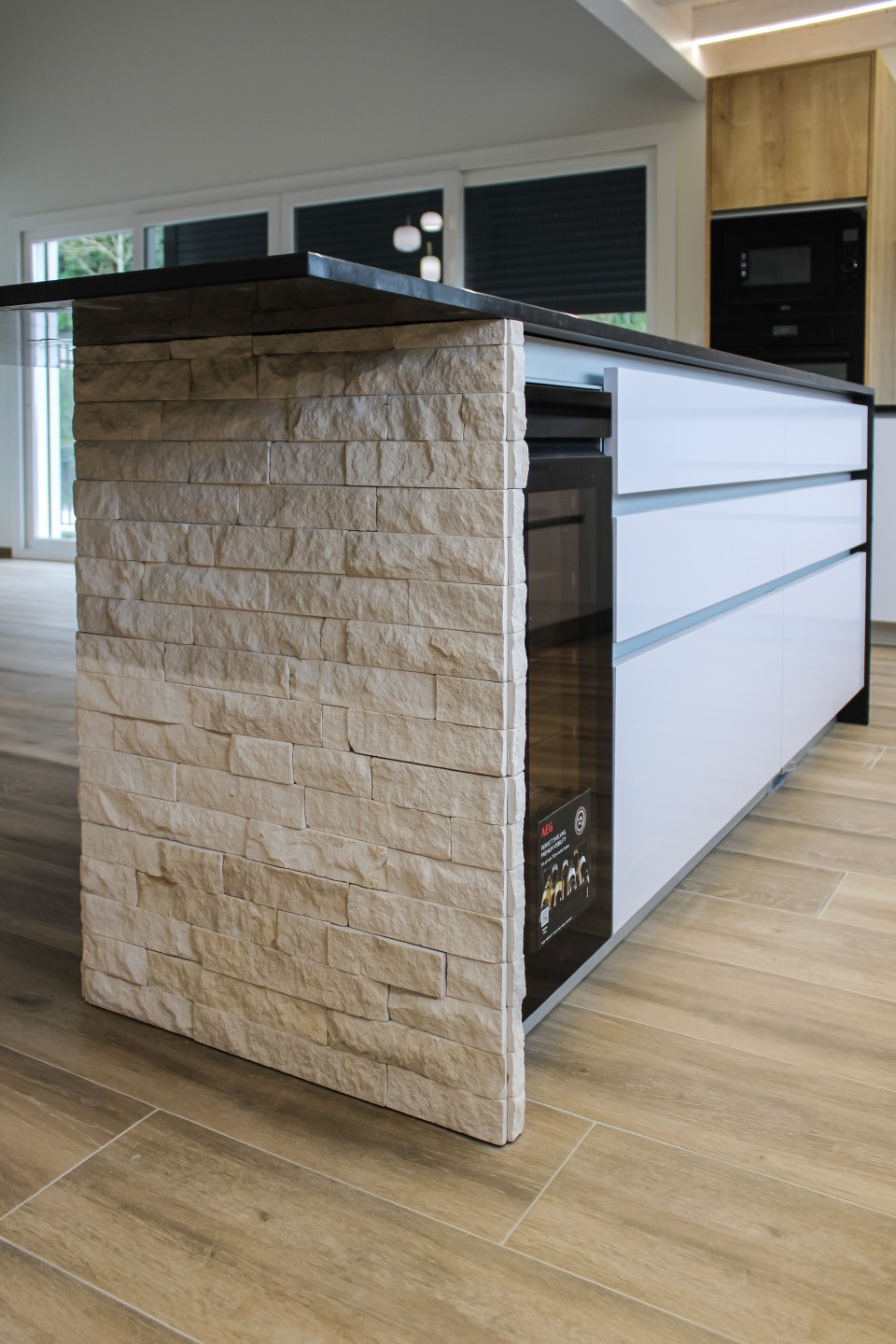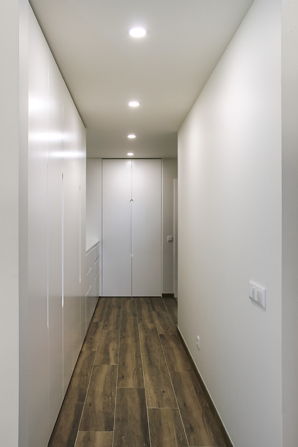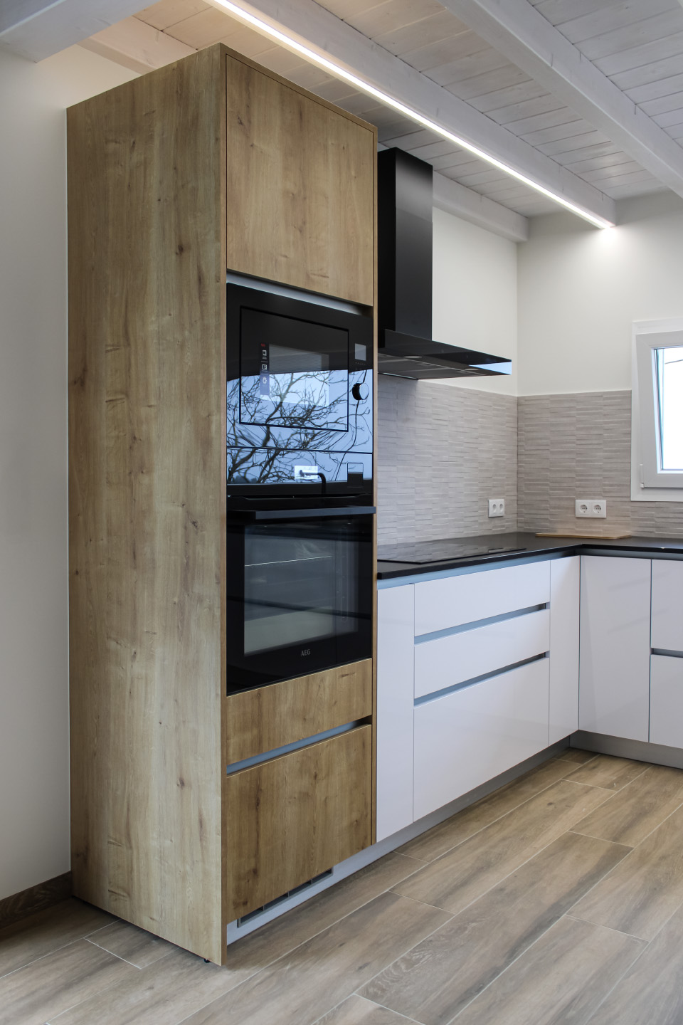 Moradia com carpintaria em lacado, móvel de estante embutido em parede de pedra, cozinha em termolaminado e escada em madeira de pinho pintado a branco