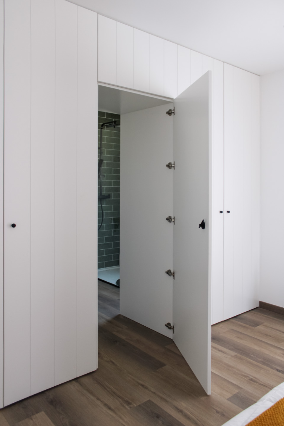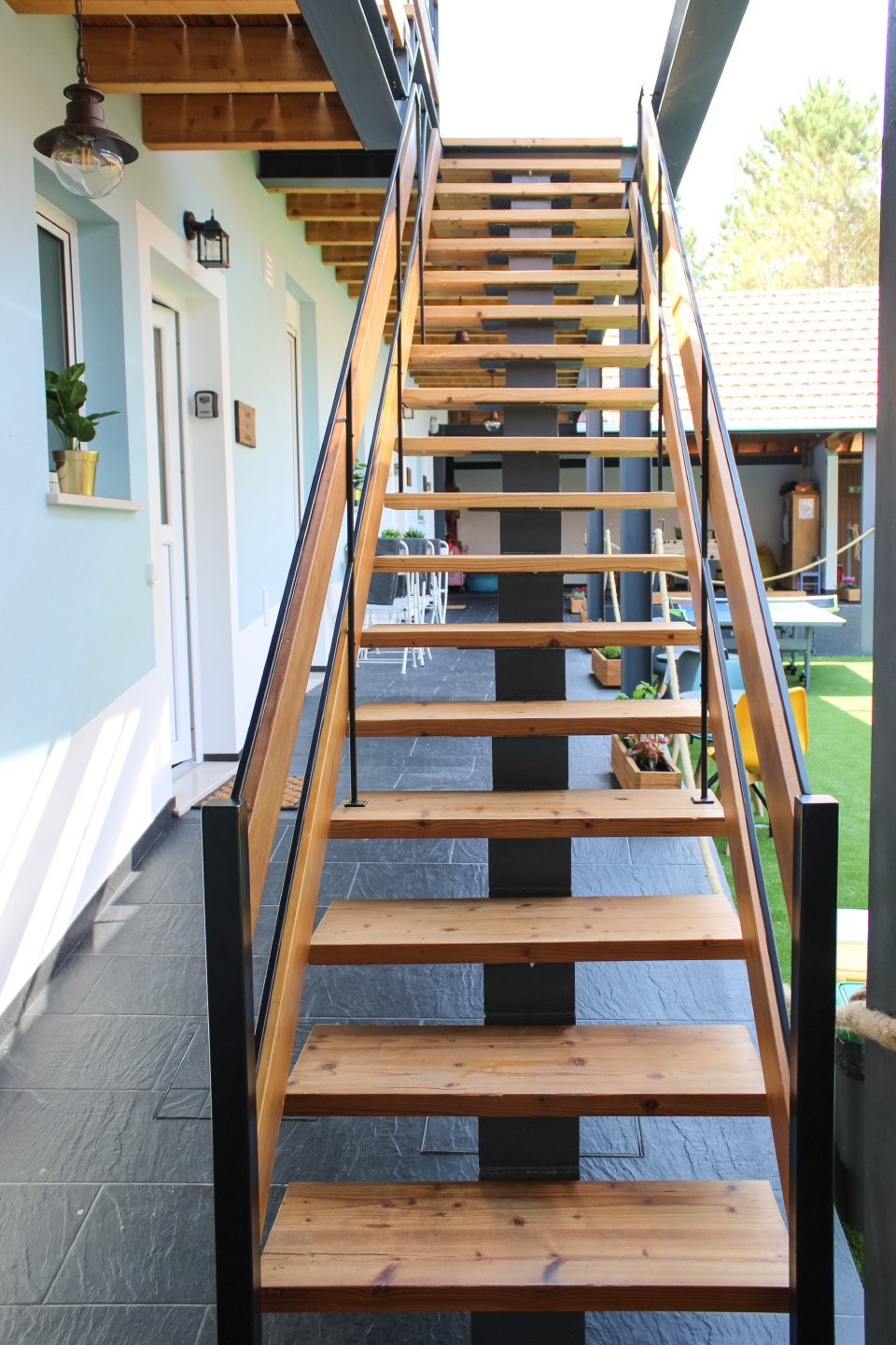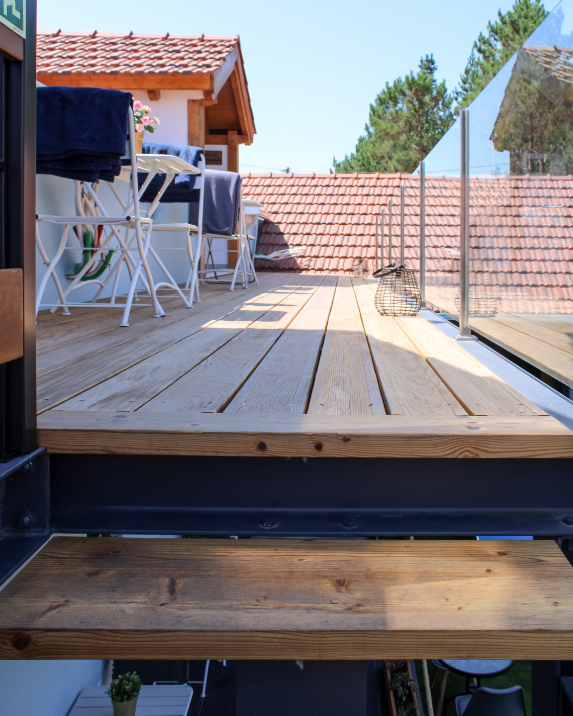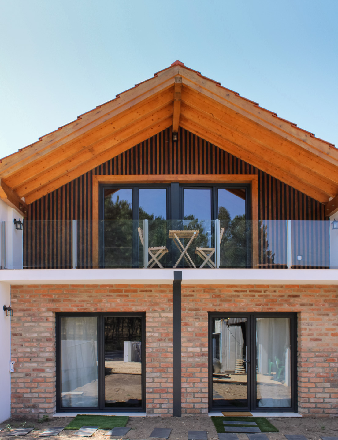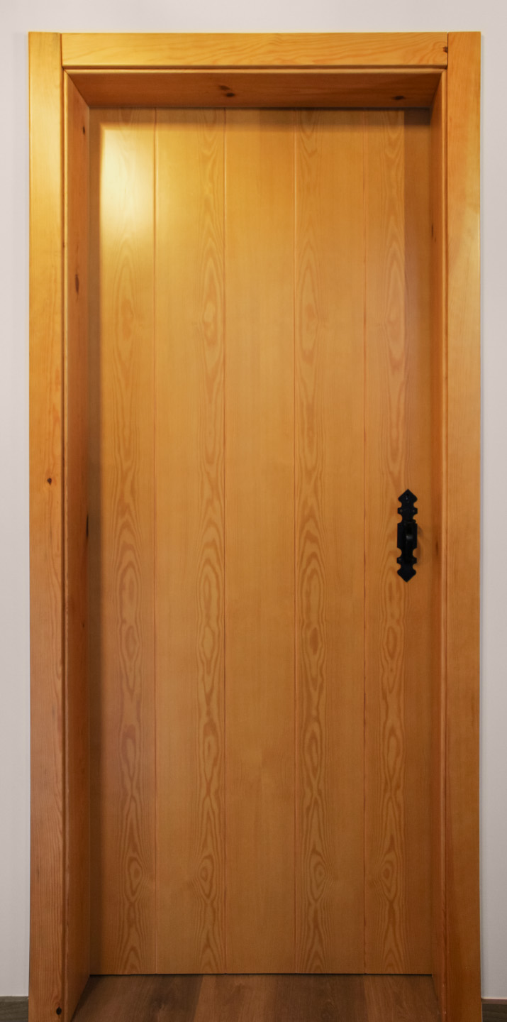Quinta com carpintaria interior em lacado e folheado pinho, portas fresadas com puxador tipo trinqueta e decoração exterior em casquinha